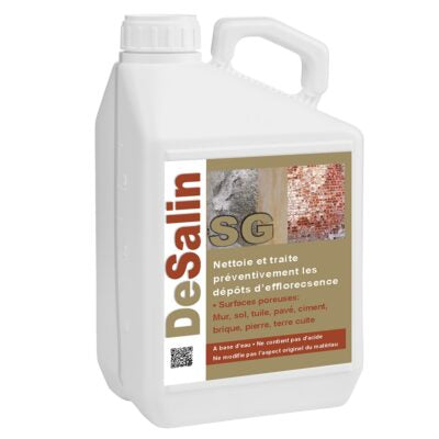 DeSalin SG es una fórmula especial que bloquea la eflorescencia en superficies porosas, extrayendo el salitre. DeSalin SG actúa encapsulando sales, especialmente calcio y magnesio, y previene el desarrollo y la formación de manchas blancas que suelen aparecer en la superficie debido a la humedad ascendente.